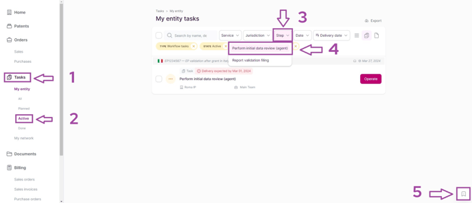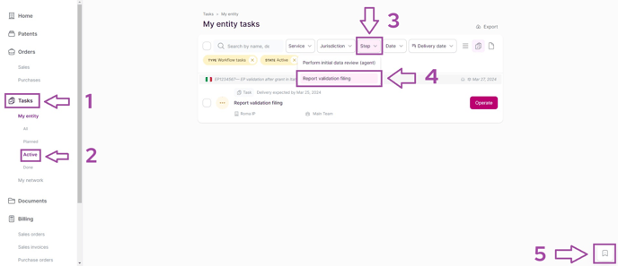 - How to do it: Tasks > Active + filter on "Step" and select "Report validation filing"