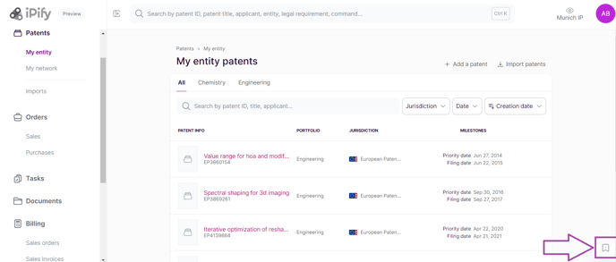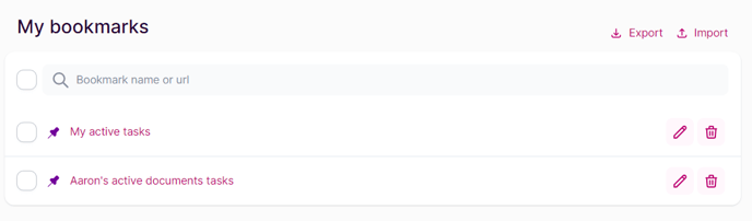 Use the bookmark to save filters on your active tasks and/or documents to be uploaded.