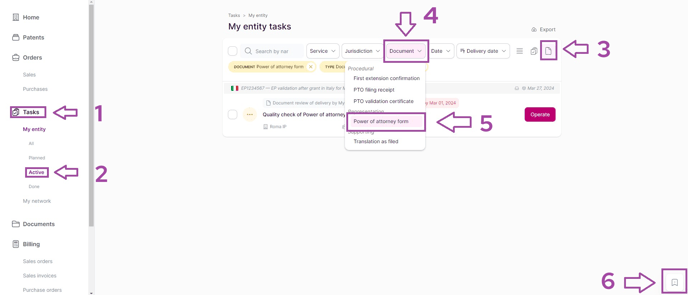 - How to do it: Tasks > Active + select Document tasks + filter "Document" and select "PTO validation publication". You will see the document step to perform: "Upload of PTO validation publication"