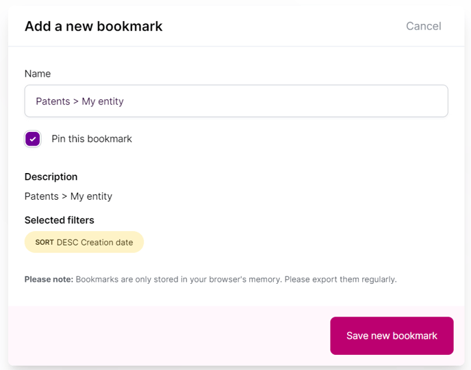 and choose a name for your bookmark or keep the default. You can also select to "Pin" your most important bookmarks