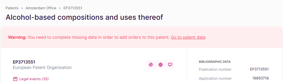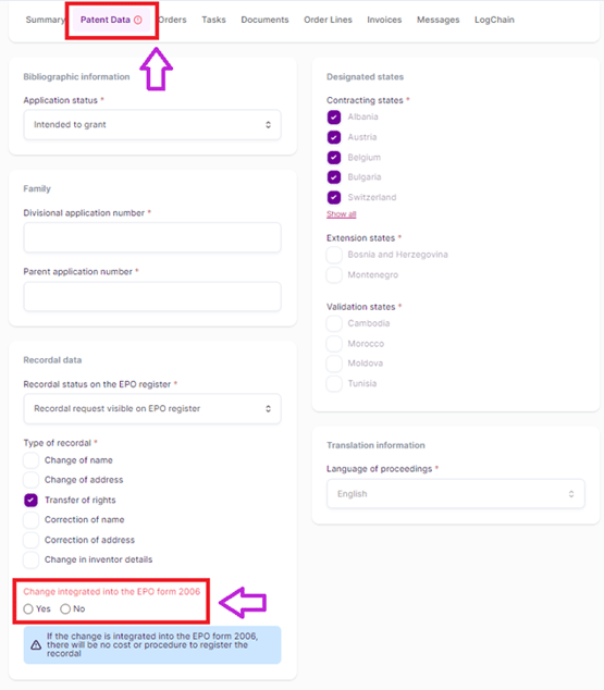 If we have automatically recognised a recordal, you will see a warning message and be prompted to navigate to Patent Data before proceeding to add your orders.