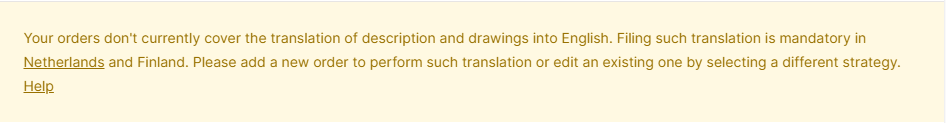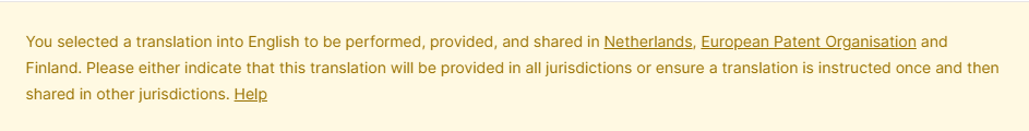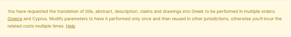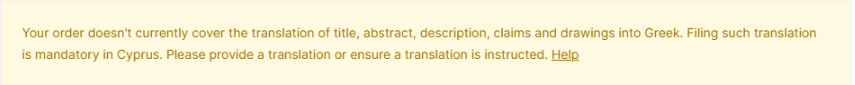Example: you have ordered an EP validation after grant in Cyprus, but have not ordered an EP validation after grant in Greece. By default, Cyprus expects to reuse the translation from Greece, but because Greece has not been ordered, this translation does not exist. Therefore a warning message is displayed.