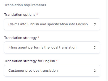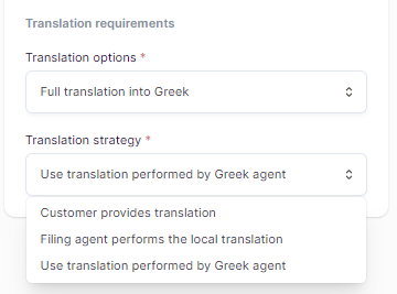 In ‘Translation strategy for English’, select ‘Customer provides translation’. This will ensure that all jurisdictions requiring the English translation are marked as the customer providing it.