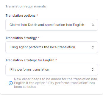For the Netherlands, you have asked for the claims to be translated into Dutch, and the description and drawings to be translated by iPify into English. You have added the order for translation into English.