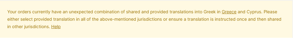 Click on the other affected orders (in this example, Cyprus) and make sure that you select 'Use translation performed by Greek agent'.