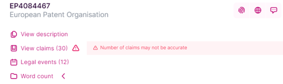 If you see a warning message next to the claims (as seen below), we draw attention to the fact that we may not have successfully captured the number of claims within the patent.