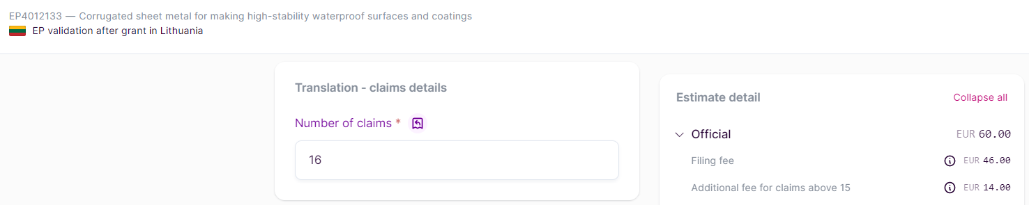 The number of claims drives the official fee costs in Lithuania and Morocco. To ensure your quote/instruction displays accurate prices, if you have selected Lithuania and/or Morocco, we invite you to amend the number of claims manually.