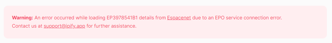 You will see the above message when we are unable to locate your patent on Espacenet. There are many reasons why this may occur, for instance, the EPO service being temporarily down.