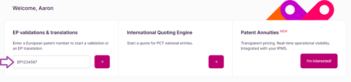 - From the "Home" page, enter the patent application or publication number in the "EP validations & translations" wizard and click the arrow