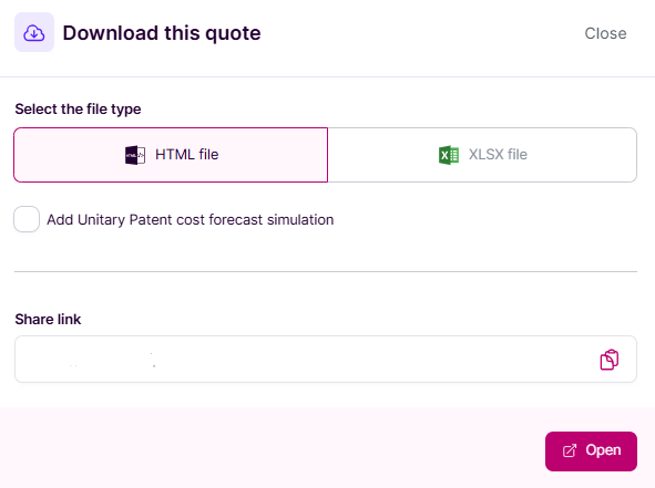 - Then you can choose how to share the quote with your client. Either as an XLSX, HTML (which can be saved as a PDF) or as a link. You can also choose to include "Add Unitary Patent cost forecast simulation" on your quote to your client (available in HTML).