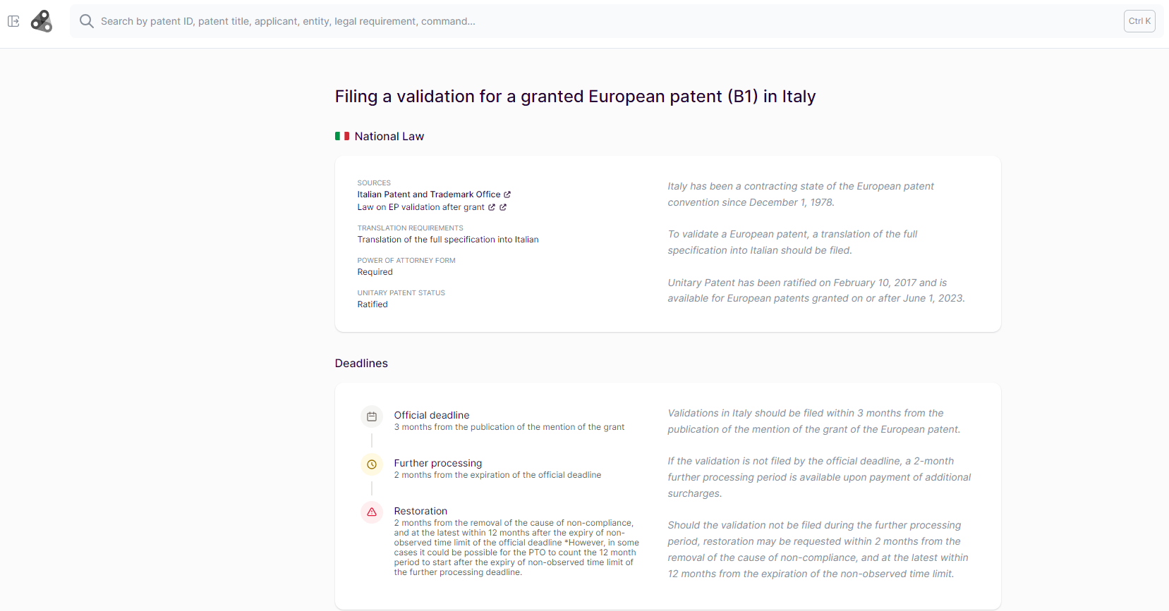 Get to know your facts about a jurisdiction's supporting documents, time extensions, UP status and more.