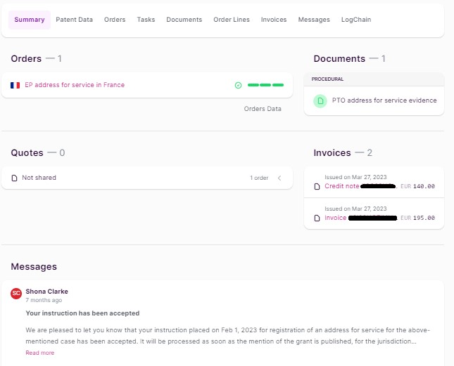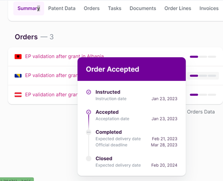 Use the Summary tab for an immediate overview of the status of your instruction and fast access to all completed orders and documents.