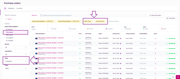 You will then filter only the orders that correspond to the next official validation deadline. You can immediately view any outstanding matters to understand the expected delivery date (note: all validation cases will have a delivery date before the official deadline as shown in the picture below).