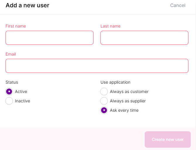 Naturally, the status will be set to active and you can set the preferred usage of the application - customer, supplier or if the user will operate as both, then "Ask every time"