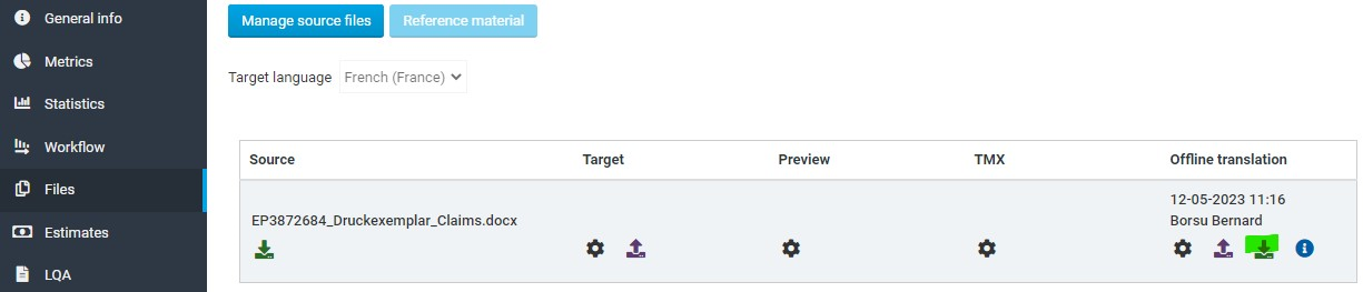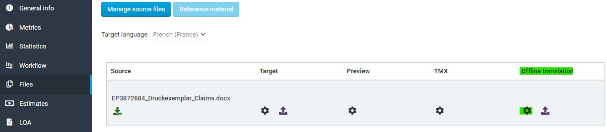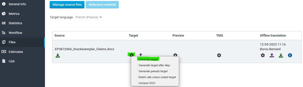 To download the translation in Word format, click on the cog wheel under "Target" to generate the target Word document.