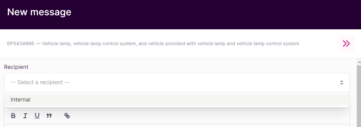Under "Recipient", select iPify and write your message. The message will be tied to your case so there is no need to specify your reference or the patent number.